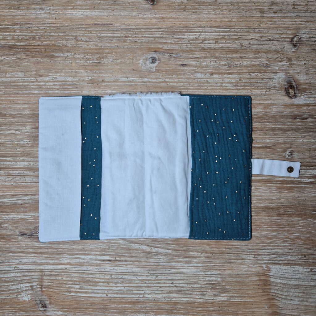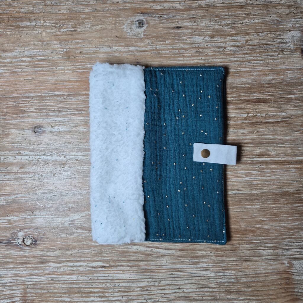 – Un tissu uni ou à motif pour faire faire le lien entre l’avant et l’envers sur l’emplacement du dos du carnet de santé.